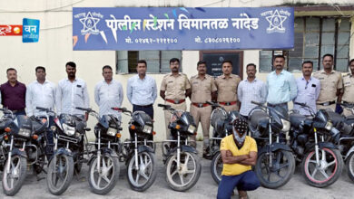 नांदेड (प्रतिनिधी): विमानतळ पोलिसांच्या डी.बी. पथकाने चोरीच्या मोटारसायकली विक्रीसाठी ठेवणाऱ्या अट्टल गुन्हेगाराला पकडून तब्बल १० चोरीच्या मोटारसायकली जप्त केल्या…