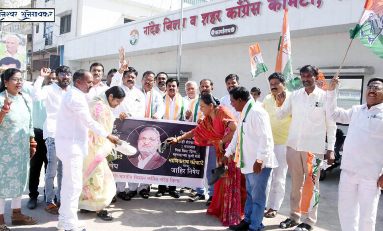 नांदेड : हाली एक रुपया भिकारी पण घेत नाही आम्ही शेतक-यांचा एक रुपयात पिक विमा भरून घेतो असे शेतक-यांची टिंगल करणारे बक्तव्य राज्याचे कृषिमंत्री माणिकराव कोकाटे यांनी नुकतेच केले होते. कृषीमंत्र्यांनी शेतक-यांची माफी मागण्यांच्या मागणीसाठी अखिल भारतीय किसान नांदेड जिल्ह्याच्यावतीने कौग्रेस कमिटी कार्यालयामोर रविवारी त्या वक्तव्याचा निषेध करत कृषी मंत्र्याच्या प्रतिमेस जोडो मारो आंदोलन खा. रविंद्र पा. चव्हाण यांच्या प्रमुख उपस्थित करण्यात आले.