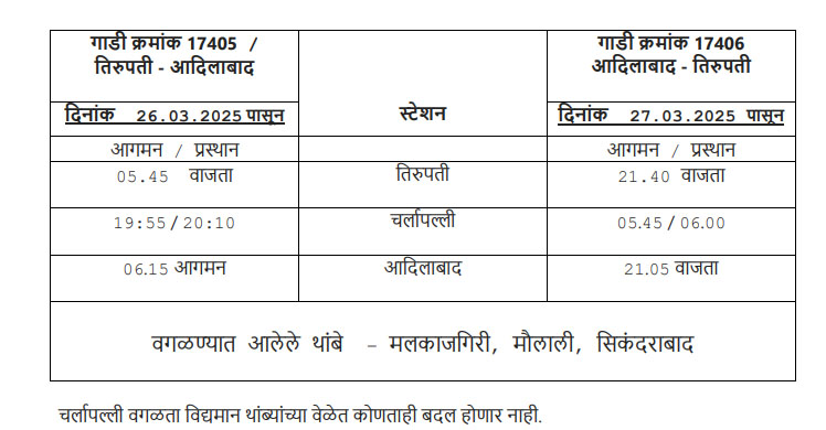 गाडी क्रमांक 17405/17406 तिरुपती आदिलाबाद- तिरुपती कृष्णा एक्सप्रेस च्या मार्गात दिनांक 26 मार्च पासून तिरुपती येथून सुटणाऱ्या गाडीत आणि 27 मार्च पासून आदिलाबाद येथून सुटणाऱ्या गाडीत बदल करण्यात आला आहे. हि गाडी सिकंदराबाद मार्गे न धावता चर्लापल्ली मार्गे धावेल. मार्ग बदलण्यात आल्यामुळे हि गाडी मलकाजगिरी, मौलाली, सिकंदराबाद स्थानकांवर थांबणार नाही, याची प्रवाशांनी नोंद घ्यावी हि विनंती.
