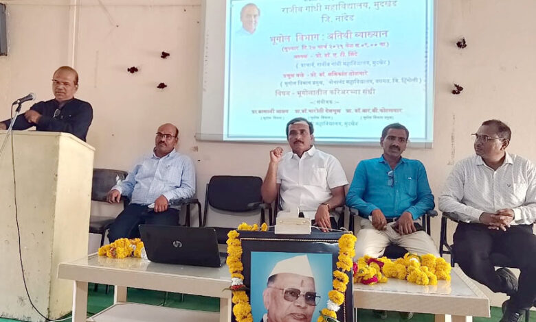 श्री.शारदा भवन एज्युकेशन सोसायटी संचलित राजीव गांधी महाविद्यालय मुदखेड येथे भूगोल विभागाच्या वतीने अतिथी व्याख्यान कार्यक्रमाचे आयोजन करण्यात आले होते.या अतिथी व्याख्यानांतर्गत डॉ.शशिकांत तोळमारे यांनी भूगोलातील करिअरच्या संधी या विषयावर सखोल असे मार्गदर्शन केले.या कार्यक्रमाचे अध्यक्ष महाविद्यालयाचे प्राचार्य डॉ.ए.टी.शिंदे होते तर प्रमुख व्याख्याते म्हणून योगानंद स्वामी महाविद्यालय वसमत जि.हिंगोली भूगोल विषयाचे प्रा.डॉ.शशिकांत तोळमारे हे होते.
