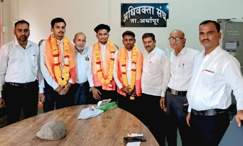 यावेळी अधिवक्ता संघ अर्धापूरचे अध्यक्ष अॅड.किशोरजी देशमुख, उपाध्यक्ष अॅड.बालाजी कोंढेकर सचिव अॅड.डि.एम.लोणे,कोषाध्यक्ष अॅड.गजानन पत्रे,ज्येष्ठ विधिज्ञ अॅड.डि.बी.दासे,अॅड. ए.आर. चाऊस,अॅड.राम जोगदंड,अॅड.ए. जी.राजेगोरे,अॅड.गौरव सरोदे व पदाधिकारी आणि सदस्यांनी परिक्षा उत्तीर्ण तिन्हीं विधिज्ञांचे अभिनंदन करून पुढील वकिली व्यवसायासाठी शुभेच्छा दिल्या.