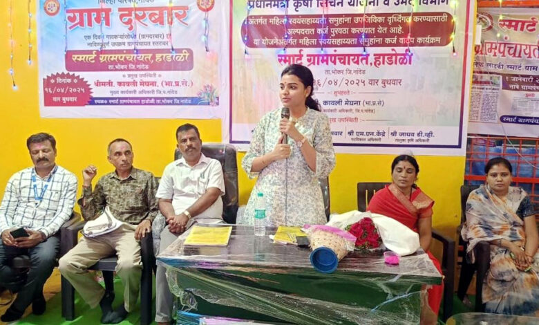 भोकर तालुक्यातील हाडोळी येथे एक दिवस गावकऱ्यांसाठी या उपक्रमाअंतर्गत आज ग्रामदरबार आयोजित करण्यात आला होता. यावेळी मुख्य कार्यकारी अधिकारी तथा प्रशासक मेघना कावली यांनी ग्रामस्थांशी थेट संवाद साधला. या कार्यक्रमास उपविभागीय अधिकारी प्रवीण मेघशेट्टी, गट विकास अधिकारी एम.एन. केंद्रे, सहाय्यक गटविकास अधिकारी अनिता सरोदे,, सरपंच अनिता अमृतवाड, उपअभियंता व्ही.ए. येरोळकर, सेवा समर्पण संस्थेचे दिगंबर देशमुख, विठ्ठल फुलारी, बालविकास प्रकल्प अधिकारी प्रणयकुमार चाटलावार, तालुका आरोग्य अधिकारी डॉ. संदेश जाधव आदी मान्यवर उपस्थित होते.