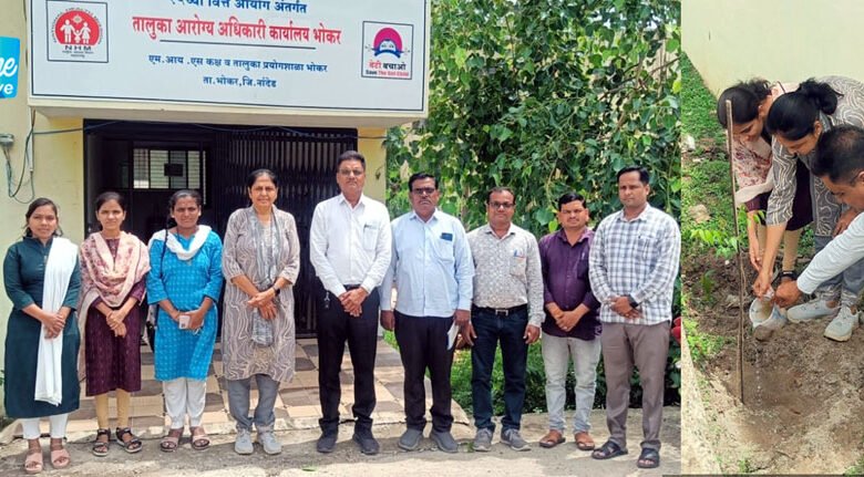 भोकर :- आज दिनांक 5 जून रोजी ” जागतिक पर्यावरण दिन ” निमित्त तालुका आरोग्य अधिकारी कार्यालय, भोकर येथील परिसरामध्ये मा. अतिरिक्त जिल्हा आरोग्य अधिकारी डॉ.सलमा हिराणी मॅडम व तालुका आरोग्य अधिकारी डॉ.संदेश जाधव यांच्या हस्ते वृक्षारोपण करण्यात आले.