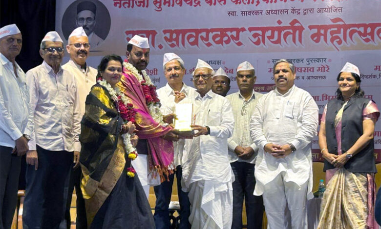 मंगळवारी नांदेड येथील कुसुम सभागृहामध्ये स्वातंत्र्यवीर सावरकर जयंती महोत्सव या रंगतदार समारंभाचे आयोजन करण्यात आले.यावेळी ज्येष्ठ विचारवंत प्रा.शेषराव मोरे,संस्थेचे सचिव ॲड.वनिता जोशी,कोषाध्यक्ष कैलासचंद्र काला,सहसचिव धनंजय जोशी,प्राचार्य डॉ. महेंद्रकुमार कुलकर्णी यांची प्रमुख उपस्थिती होती.मराठवाड्यात विविध क्षेत्रात उल्लेखनीय कार्य करणारे दिलीप ठाकूर, डॉ.संतोष मालपाणी.डॉ. मुकुंद कळंबेकर, डॉ. मल्हार लाटकर यांचा गौरव करण्यात आला.मान्यवरांच्या हस्ते आकर्षक स्मृतीचिन्ह व शाल पुष्पहार व ग्रंथ देऊन दिलीप ठाकूर यांचा सपत्नीक सन्मान करण्यात आला. प्रभावी सूत्रसंचालन करणारे डॉ. मनीष देशपांडे यांनी दिलीप ठाकूर यांना पुरस्कारासाठी व्यासपीठावर आमंत्रित करतांना असे सांगितले की,” आज आपण अशा एका व्यक्तिमत्वाचा गौरव करणार आहोत, ज्यांनी गेली दोन दशके समाजसेवा म्हणजेच आपले जीवनकार्य मानले आहे.२२ वर्षांमध्ये त्यांनी १५ लाखांहून अधिक जेवणाचे डबे गरजूंपर्यंत पोहोचवले आहेत. हे ऐकूनच आपल्या मनात एकच भावना निर्माण होते .