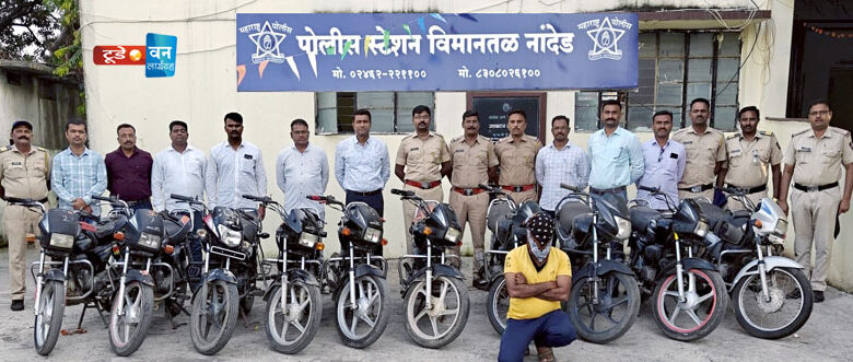 नांदेड (प्रतिनिधी): विमानतळ पोलिसांच्या डी.बी. पथकाने चोरीच्या मोटारसायकली विक्रीसाठी ठेवणाऱ्या अट्टल गुन्हेगाराला पकडून तब्बल १० चोरीच्या मोटारसायकली जप्त केल्या आहेत. जप्त मुद्देमालाची एकूण किंमत सुमारे ६ लाख रुपये इतकी असल्याचे पोलिसांनी सांगितले.
