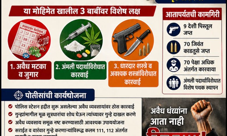 या मोहिमेअंतर्गत पोलीस ठाणे प्रभारी अधिकाऱ्यांना त्यांच्या हद्दीत सुरू असलेल्या अवैध व्यवसायांवर ठोस कारवाई करणे, संबंधित गुन्ह्यांमागील सूत्रधारांचा शोध घेणे, त्यांच्यावर गुन्हे दाखल करणे तसेच अवैध धंदे समूळ नष्ट करण्यासाठी उपाययोजना करण्याच्या सूचना देण्यात आल्या आहेत. सराईत व वारंवार गुन्हे करणाऱ्या आरोपींविरुद्ध कलम १११ व ११२ अंतर्गत प्रतिबंधात्मक कारवाई करण्याचेही नियोजन करण्यात आले आहे.