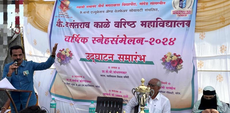 नांदेड दि. 13 कलेची जोपासना करून कोणताही व्यक्ती परिपूर्ण आयुष्य जगू शकतो असे प्रतिपादन प्रसिद्ध साहित्यिक डाॅ.मनोज बोरगावकर यांनी केले ते देगलूर नाका येथील कै. वसंतराव काळे वरिष्ठ महाविद्यालय वार्षिक स्नेहसंमेलनाचे उद्घाटक म्हणून बोलत होते. देगलूर नाका येथील कै.वसंतराव काळे वरिष्ठ महाविद्यालयाच्या वार्षिक संमेलनाची सुरुवात आज झाली यावेळी आयोजित करण्यात आलेल्या कार्यक्रमाच्या अध्यक्षस्थानी महाविद्यालय विकास समितीचे प्रा.डी.बी. जांभरुणकर हे होते तर प्रमुख उपस्थिती संस्था सचिव अर्जुमंदबानो यास्मिन यांची होती.प्रमुख पाहुण्यांचा परिचय प्रा.पुष्पा क्षीरसागर यांनी करून दिला कार्यक्रमाचे प्रास्ताविक प्राचार्य डॉ.उस्मान गणि यांनी केले.
