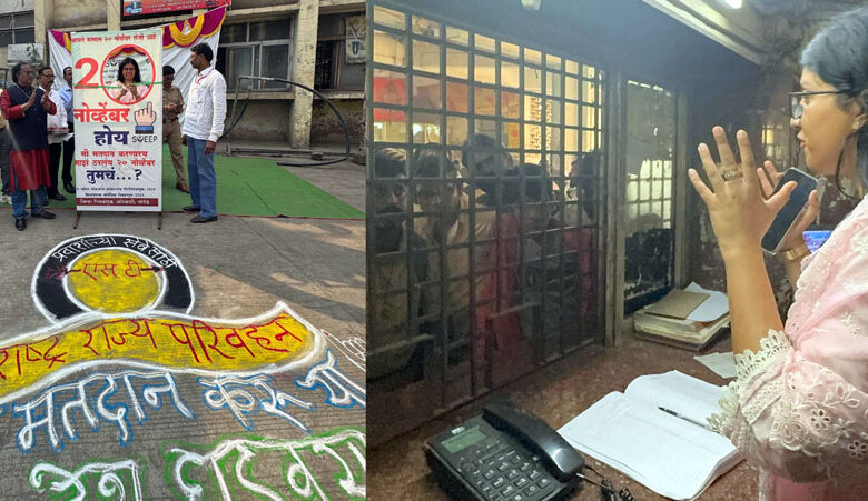 गाडी अमूक या गावाला जाणार असल्यााची नेहमीची सूचना ऐकण्याुची सवय असणाऱ्या प्रवाशांना आज वेगळ्या आवाजात वेगळी सूचना ऐकायला मिळाली. सूचना होती… लोकशाहीच्याय बसमध्येज बसताना मतदानाची तिकिट काढण्याूसाठी, आपल्याच पसंतीच्या उमेदवाराला 20 नोव्हेंबरला #मतदान करण्यासाठी विसरु नका ! असे आवाहन केले.